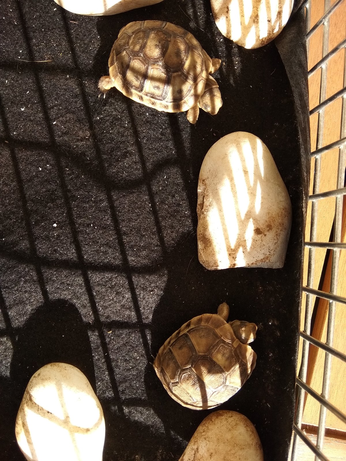 Son tortugas moras, Testudo graeca. Lo que mejor les va es el diente de león, pero lo primero deberíamos saber qué recinto habitan. Ahora mismo es más bien época de hibernación.
