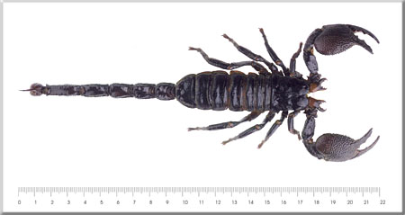Yo apostaria por el Pandinus Imperator, su tamaño normal ronda los 15cm, segun esta informacion que lei en una web alcanzan los 20cm