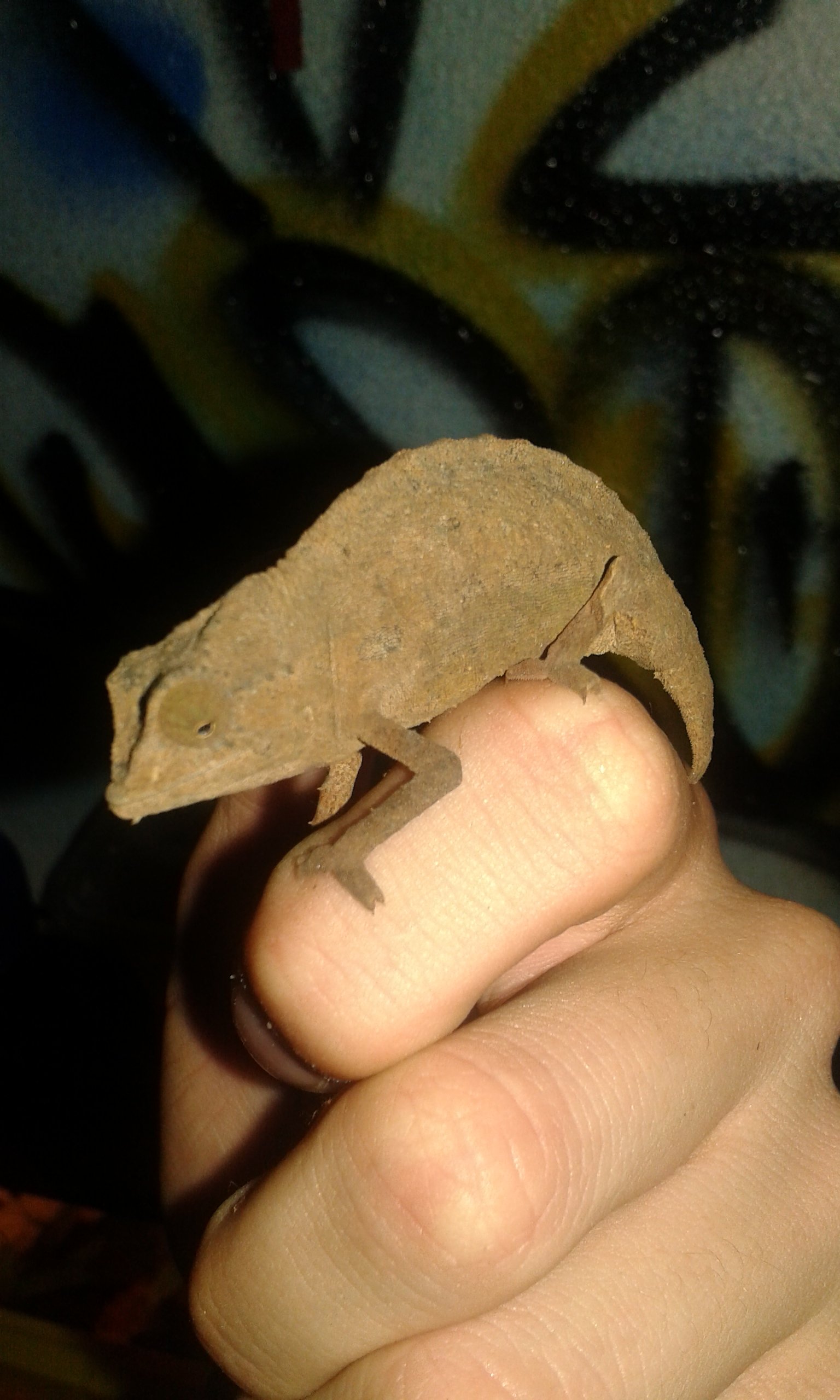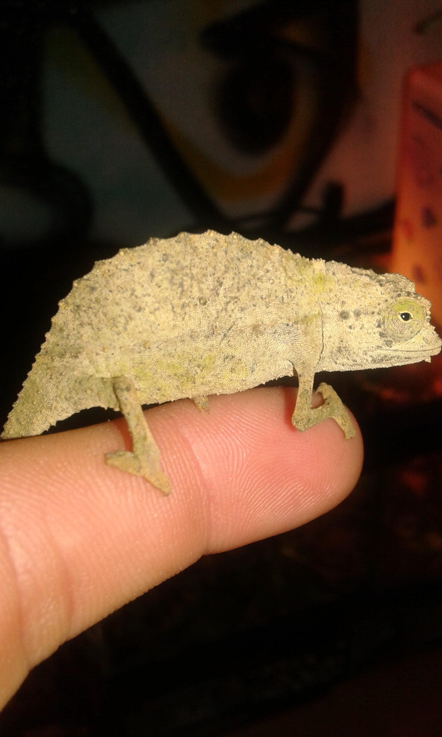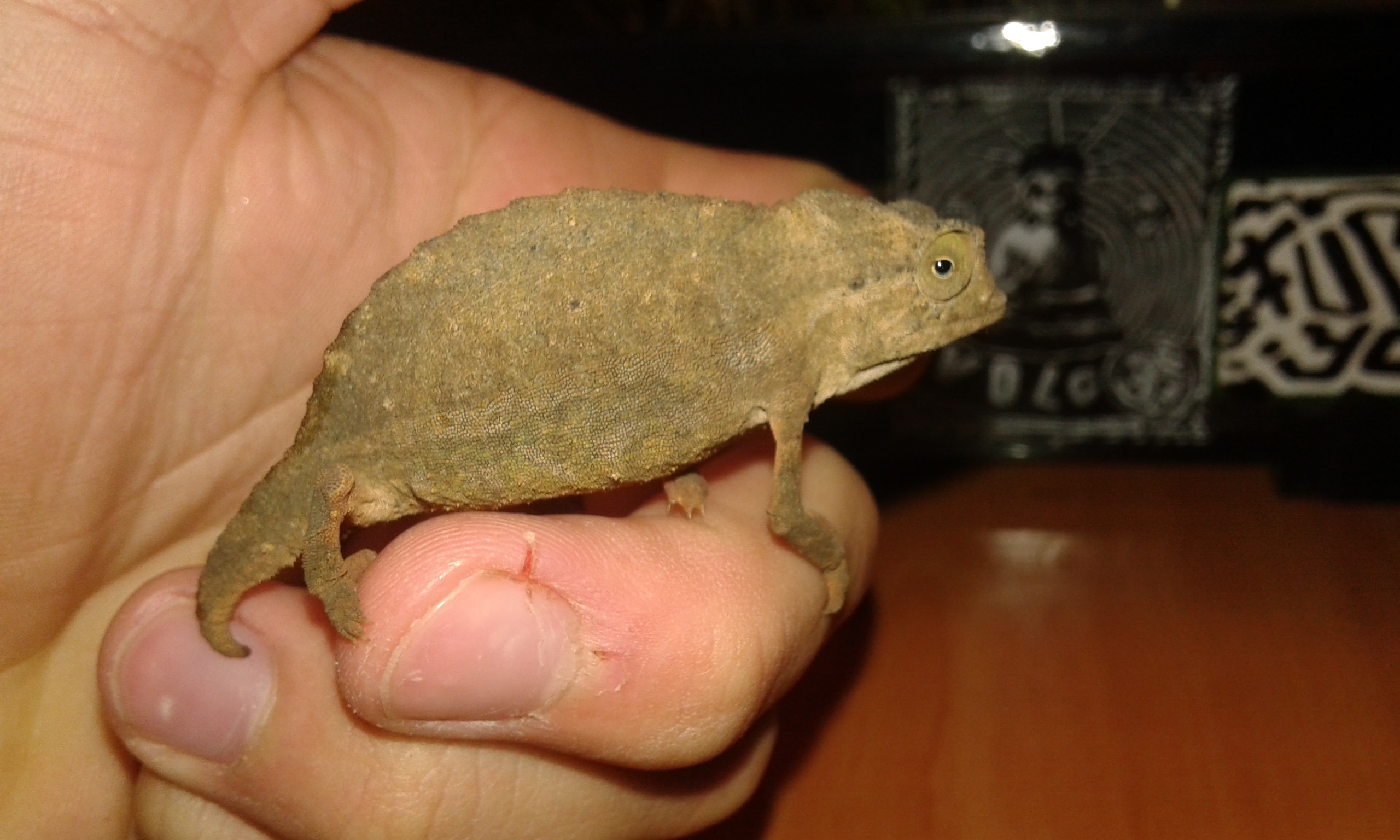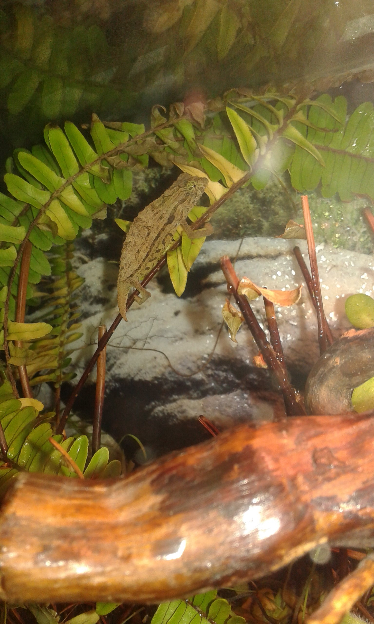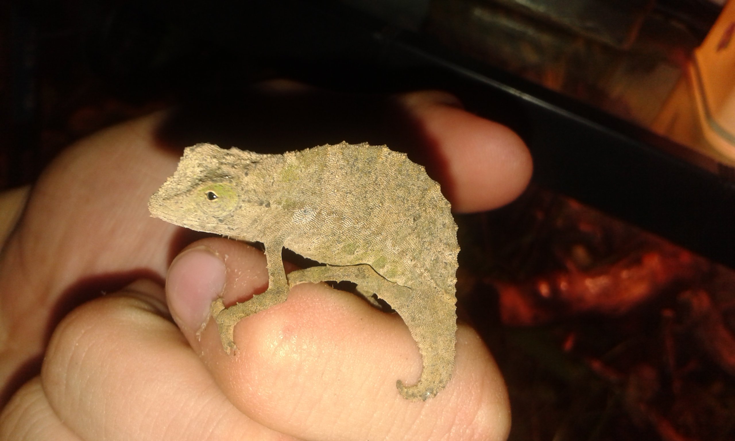 Dos machos, me juego el cuello. R. Brevicaudatus ambos ni R. Temporalis, ya que tiene el hocico diferente y carece de esas escamas de debajo de la barbilla (en inglés, el R. Brevicaudatus lo llaman "pigmy bearded chameleon" o camaleón barbudo enano), por supuesto ni hablamos del R. Spinosum ya que no tiene parecido con los demás Rhampholeon porque como su nombre indica (R. Spinosum) tiene el cuerpo plagado de espinas y una "nariz" muy característica.