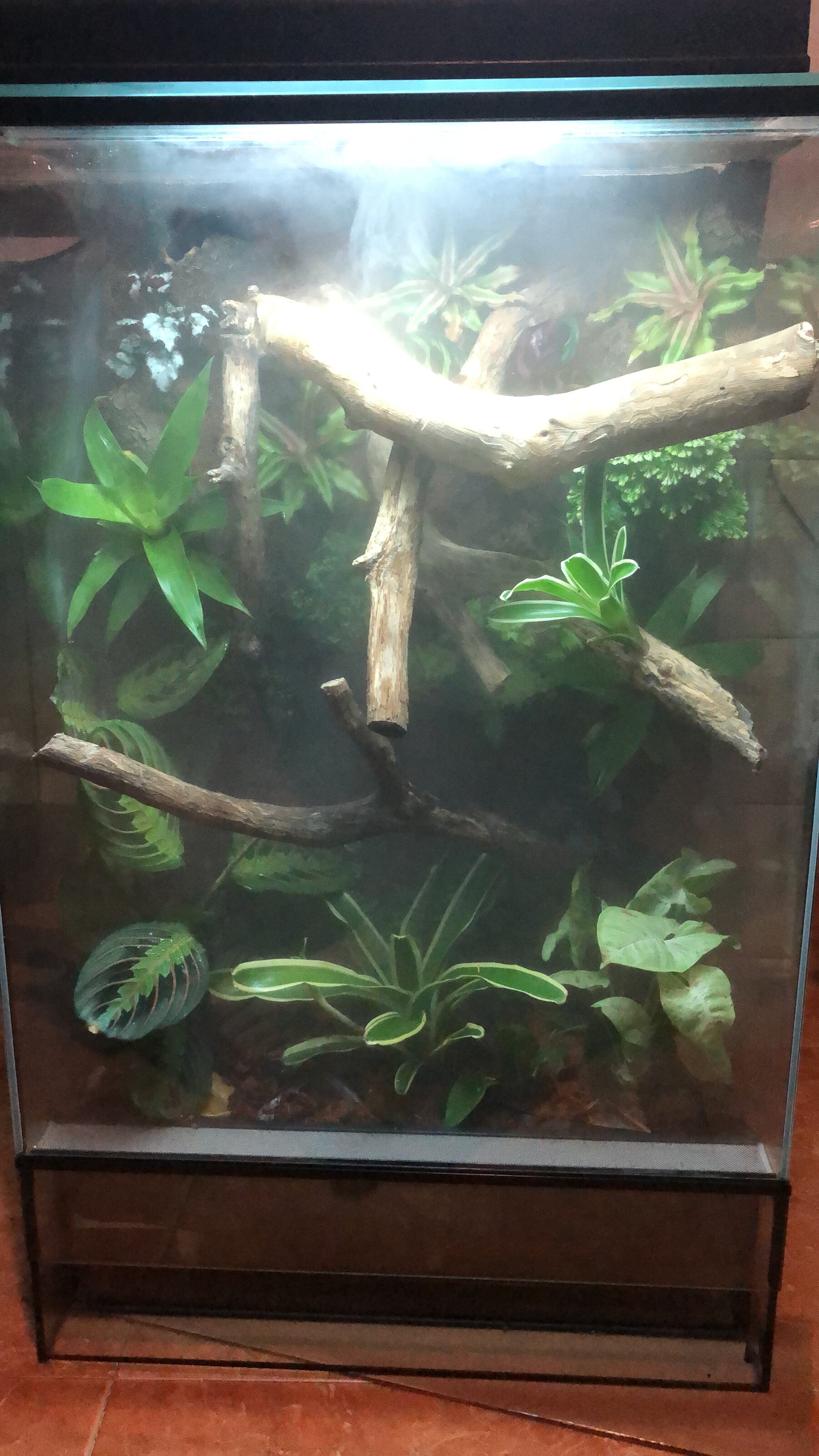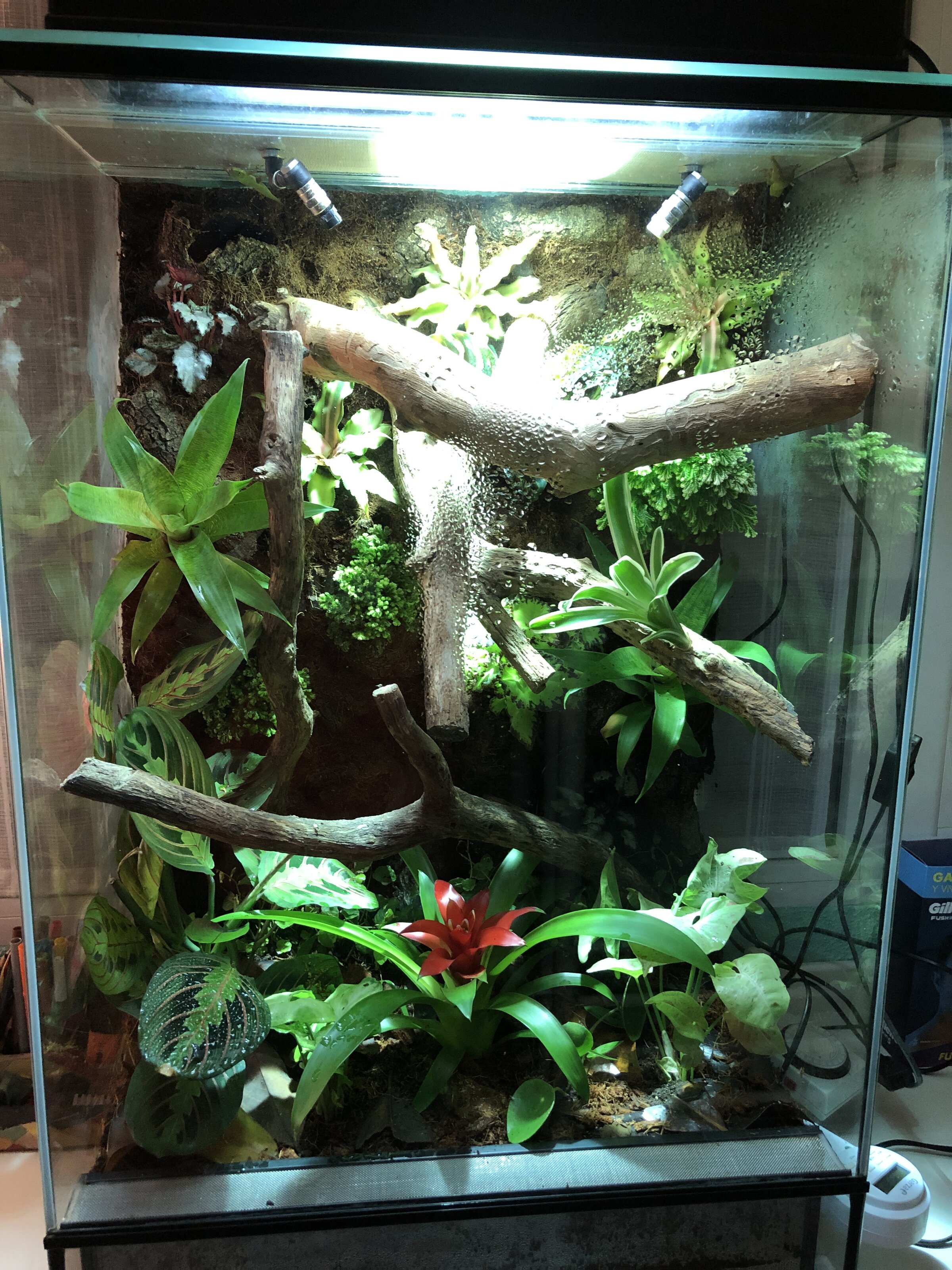 He terminado un nuevo proyecto de un terrario 50*40*80 para dos phelsumas laticauda (introduciré un macho por si alguien me quiere vender uno). Tiene sistema de lluvia, Nebulizador, y cable térmico controlados con un Higrostato/termostato. También tiene un sistema HID a una altura determinada para que la radiación UVB y la temperatura de asoleamiento sea la idónea. No tengo bambús porque no me cuadraba con el diseño pero tiene muchos escondites. Me gustaría que me dierais críticas por mínimas que sean y sugerencias.