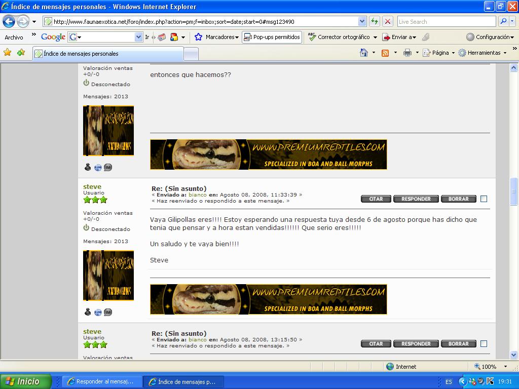 Mi pequeño problema con el fue que no le vendi una boa que tenia y menudo cabreo pillo... hasta el punto de llamarme gritando y insultanome en un par de ocasiones. Su primer privado no lo tengo una verdadera lastima ya que decia que no sabia si comprarme la boa o no, porque en la habitacion de mis bichos tenia regius que eran de granaja. La verdad es que ese comentario me dolio porque no tendre las mejores instalaciones del mundo pero lo que si tengo es mucho cariño con mis bichos y no les falta de nada.