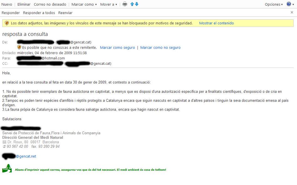 Al fin he recibido respuesta por parte del Servei de Protecció de Fauna,Flora i Animals de Companyia (Servicio de proteccion de Fauna, Flora y animales de Compañia de Catalunya)