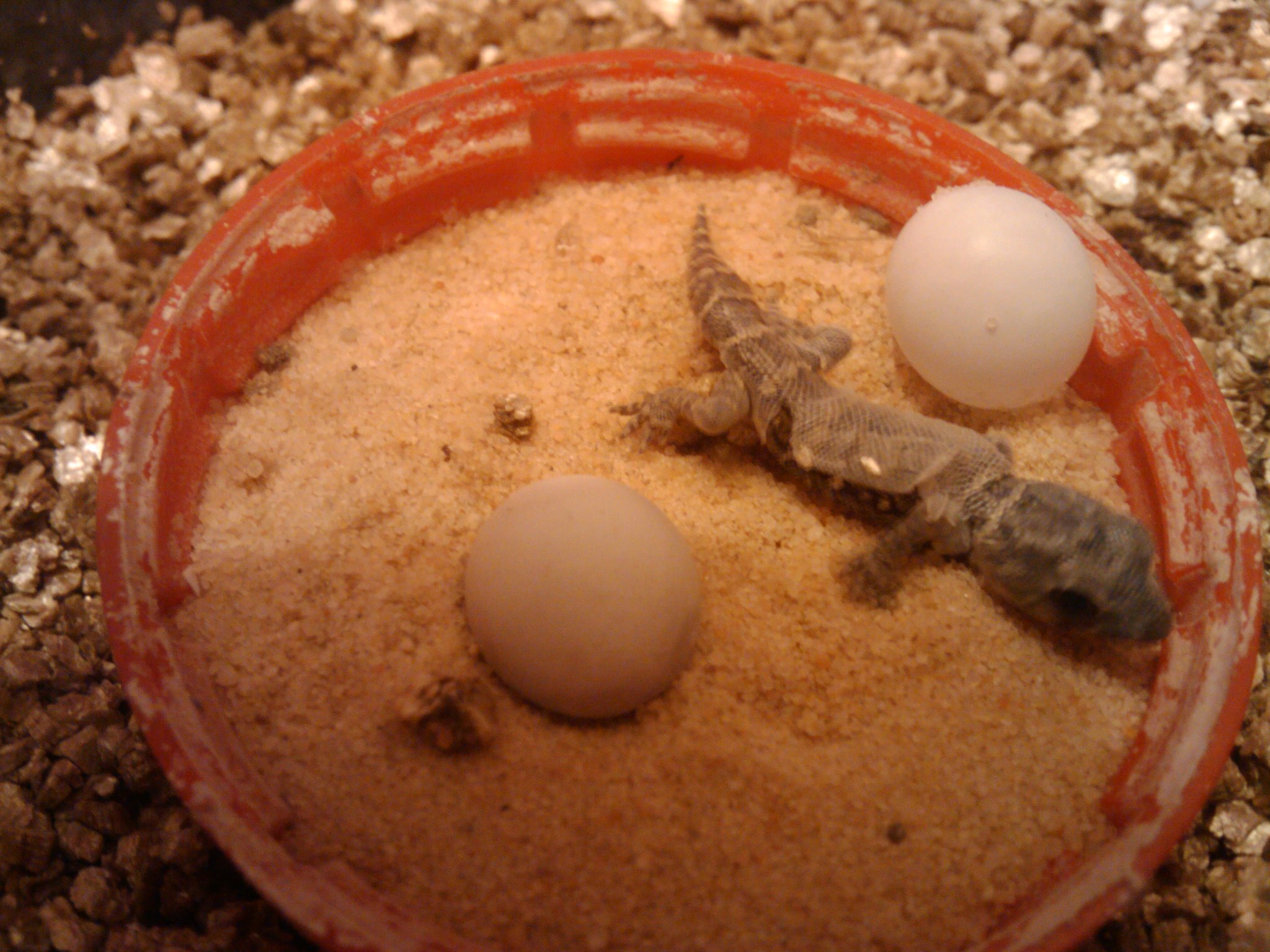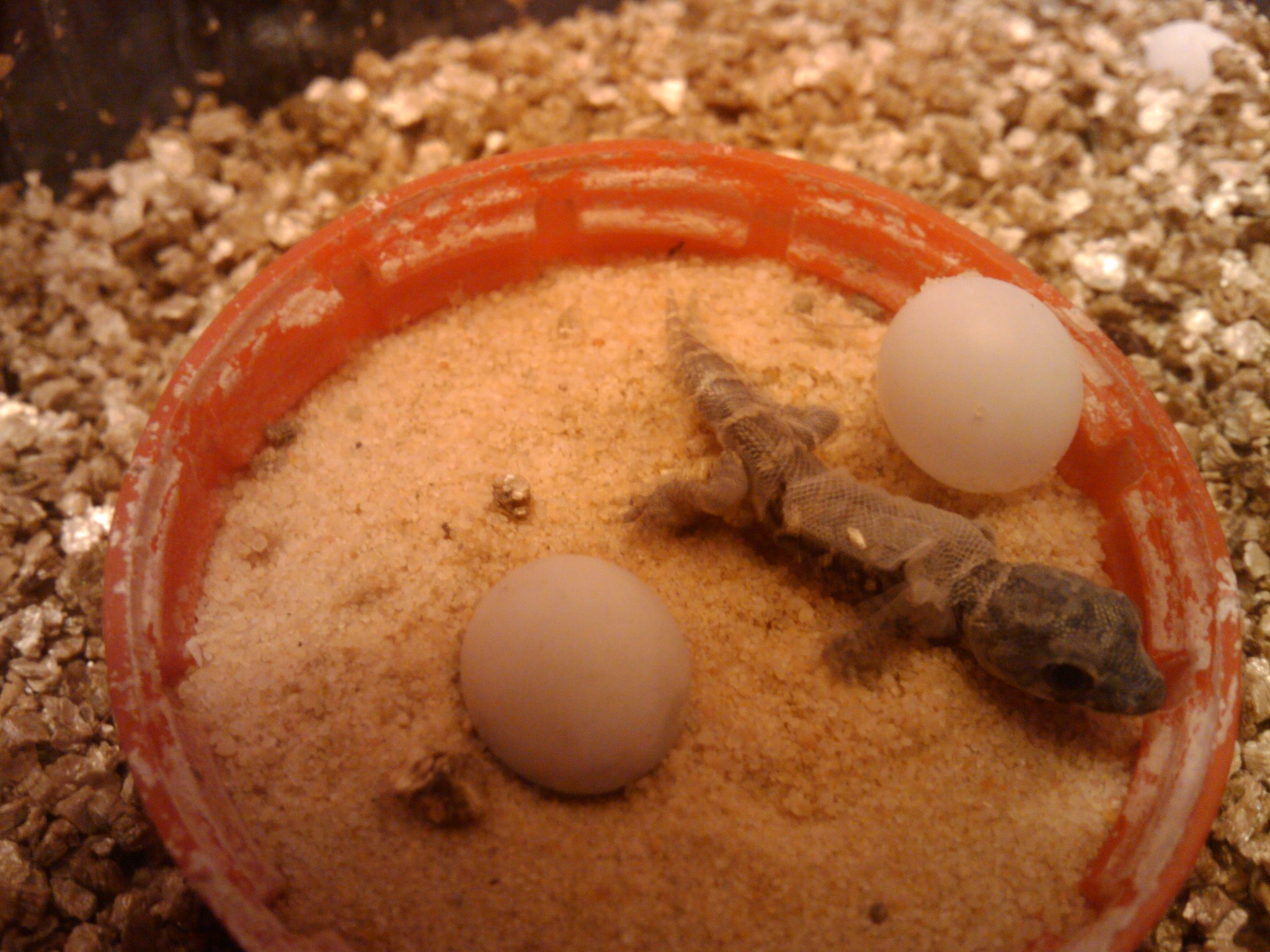 Pues los mantengo en los típicos tuppers de feria de 25x18cm. Con Desert Sand, un escondite y un cacharro con agua. A una temperatura de 28-30º.