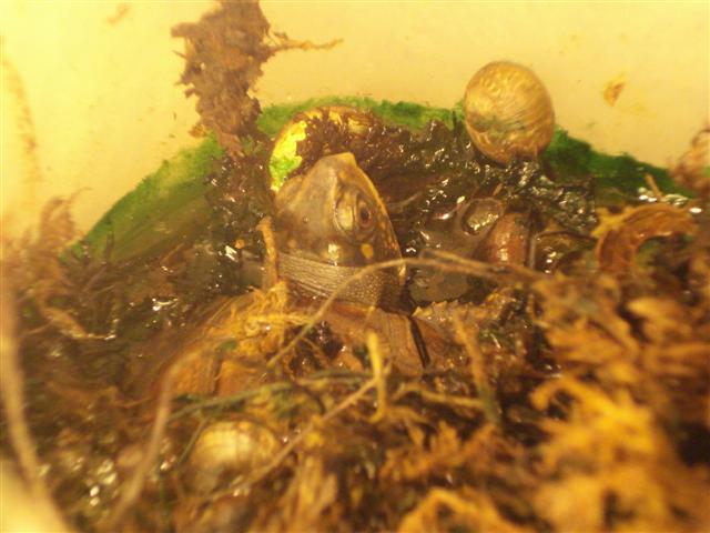 La caja la tengo inclinada aunque no se aprecie en la imágen y la tengo con un dedo de agua en la parte más baja, la zona inundada ocupa algo menos de la superficie de la caja. Echo en cantidad lombrices, grillos pequeños y tenebrios aparte de poner pienso de acuáticas, higadillos de pollo o pienso enlatado de gatos alternando. Limpio la caja a diario con un chorrito de lejía y un buen enjuague. La carolina está con las triunguis más "canijas" en total 9 ejemplares con esta. No sé si serán muchas en un mismo recinto, aunque se pierden entre las plantas ya que tienen muchos refugios. Sería interesante y de agradecer una foto de tus cajas y cuantos ejemplares mantienes por caja, aunque con esos tamaños imagino que pocas. No sé si será por el cambio pero mi carolina a cogido algo más de peso, un par de gramos, ahora pesa 20gr. Si te agobias mucho con el crecimiento de las tuyas ya sabes donde encontrarme, no quiero que se me "malcríe" sola, va pidiendo alguna hermanita, je, je.. Saludos.