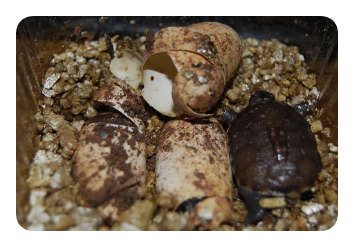Al salir la tortuga, deambulará por la vermiculita, y si sus hermanas no han nacido, puede incluso girar los huevos y matar a sus hermanas si no han empezado a romper el huevo. Pero una vez iniciado este proceso, el huevo puede bascular mientras la tortuga intenta salir.