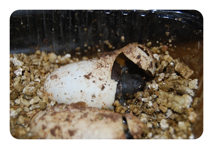 Tras 58-60 días a 28ºC, los huevos eclosionan. Se puede provocar el proceso pulverizándo ligeramente los huevos con agua. Si todo ha ido bien, las crías deben tener muy poco saco vitelino. El huevo se abre por un lado sin observar rotura, puesto que la cáscara no es dura, tiene al exterior consistencia de tiza.