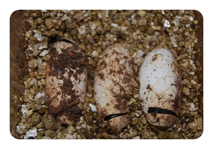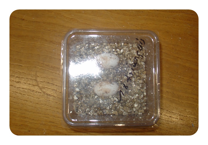 Los huevos, inicialmente son blandos, si los apretamos demasiado pueden incluso deformarse ligeramente. Si no los recolectamos inmediatamente, y el lugar de puesta no era el más adecuado, pierden agua con mucha facilidad. Añadir algo de Sphagnum húmedo a la cajita y cubrir totalmente los huevos hará que se hinchen de nuevo. Yo los dejo semienterrados.