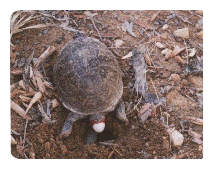 A finales de marzo o principios abril, aproximadamente un mes después de aparearse, en caso de tener macho, o porque si, si ha habido fecundación demorada, las hembras de Terrapene carolina empiezan a andar nerviosas y a oler insistentemente la tierra.
