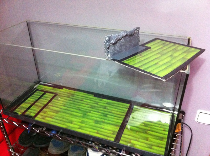 Es un terrario para una eriza, como base tiene un hule, y encima de este he puesto un plástico duro paa que no lo raje ni lo rompa (mas vale prevenir que curar).