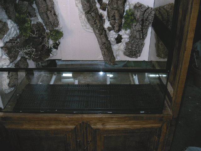 el fondo es de poliuretano con placas y troncos de corcho serrados por la mitad sin la madera interior y muchos tiene agujeros ya para ir plantando bromelias y pequeñas plantas. ;) Por la parte superior se puede ver los primeros tubos de riego de jardin que van a ser el sistema de lluvia y ademas ira un sistema de pulverizado... O sea todo bien completito para que las ranitas tengan de todo un poco.. Ademas de esto en cuanto cobre este fin de mes pondre el sistema de Filtrado que ira en el lado derecho con un filtro exterior tipo cannister que saque el agua desde el doble fondo la fitre y esta retornara en forma de una cascadita el el mismo lado derecho...