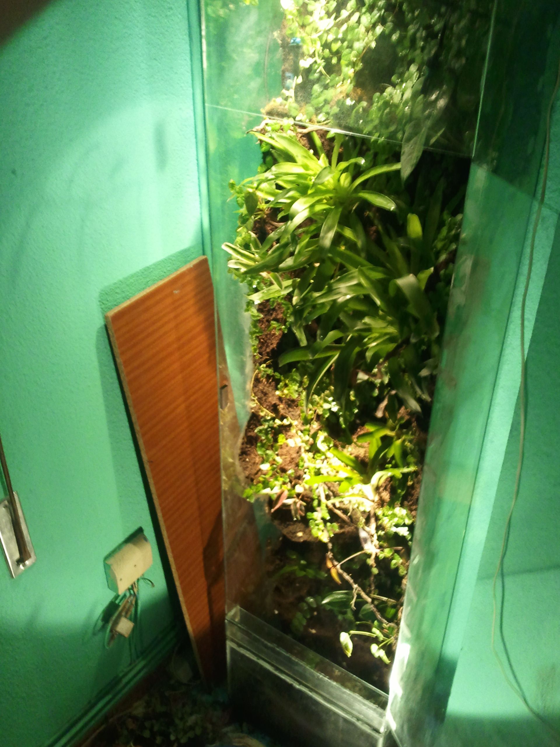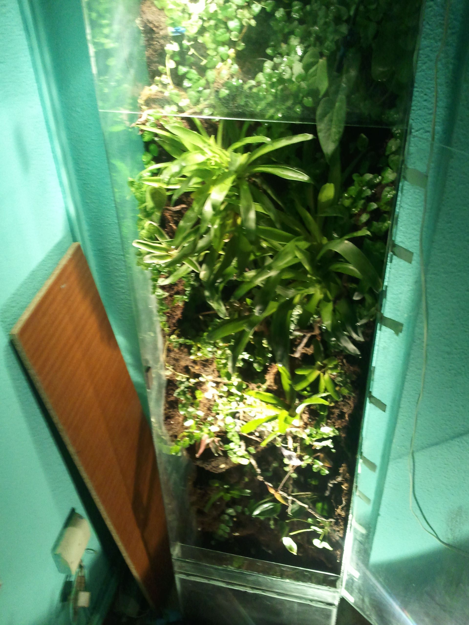 Queria que me dieseis vuestra opinion, tengo un terrario de 2 metros de altura, 47 de ancho, y 35 de profundo, aqui os dejo unas fotos, queria saber si seria apto para rackos, o tendria que quitar algunas plantas¿? pondria unas cañas de bambu y mas lianas para que lo aprovechen bien, en la parte de abajo tengo agua, unos 30 centimetros, la podria dejar? o seria mejor quitarla y poner fibra de coco? cuantos animales podria tener en este terrario.