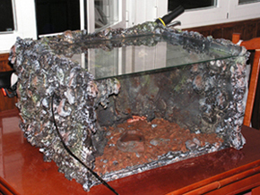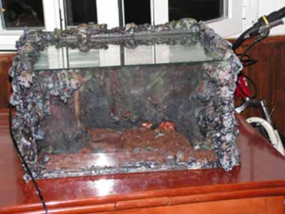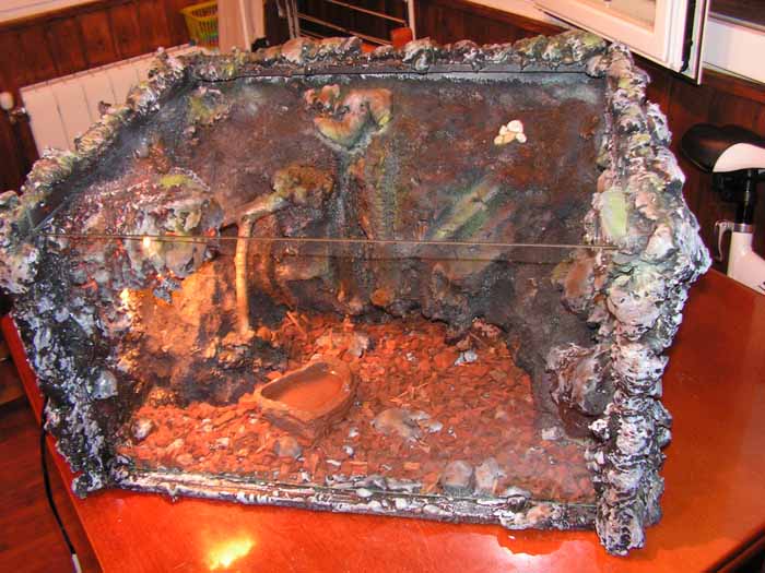 Bueno, el terrario es madera en su totalidad excepto el frontal y la tapa superior. Tiene las correderas hechas en la misma madera. Luego esta todo recubierto de espuma de poliuretano. El interior esta recortado y con cola de carpintero pegado el coco. Luego el "secreto" de los colores para el efecto roca (en este caso muy oscura, procuraré el proximo hacerlo mas claro) es pintar toda la espuma de gris y luego ir dandole sombras de negro, no tiene mas. Eso si, esta hecho con aerografo. El tiempo... pues mas o menos 1 semana.