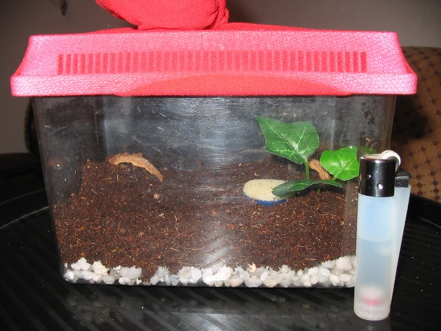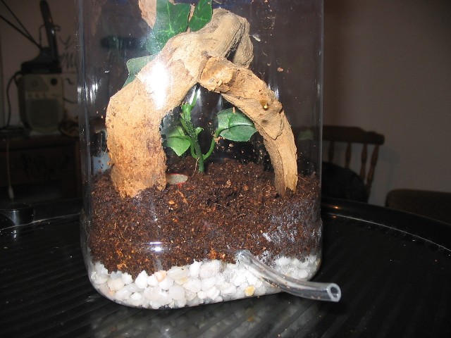 Pook:La grava del fondo es como una especie de drenaje ya q si te fijas en la parte derecha de los terrarios se ve una especie de tubo q se introduce en la base del bote por donde pensaba inyectar agua al sustrato mediante una jeringuilla para no molestar a las irminias por arriba y lograr humedecer el suelo.