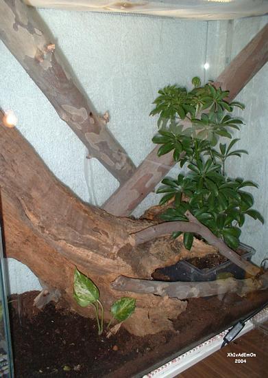 Os pongo el terrario... ke mide 74x80x40 (LargoxAltoXAncho), tiene tapadera de tela metálica y le he puesto tres o cuatro cm. de tierra para macetas como sustrato.. algunas ramas de.. Plátano (no platanera) y un tronco grande de Haya.