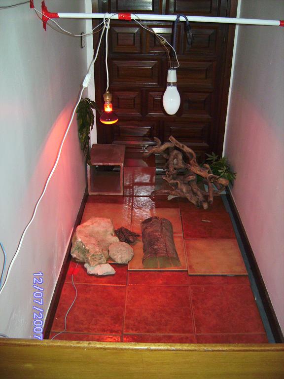 Aun le falta varios detalles, como una bombilla infraroja potente para calentar ( la que veis en la foto es una de vapor de mercurio, para los rayos u.v.a/ uv.b), una palangana de agua, puede que algún tipo de substrato ( aun no se me ocurre ninguno wapo ), etc etc.
