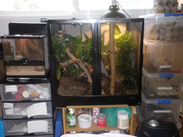 Bueno despues de la expo, nos animamos a hacer fotillos de nuestras modestas instalaciones, espero vuestras opiniones. Para empezar unas fotos de nuestro terrario de ranas de la leche; tenemos un grupo compuesto por dos adultos y un juvenil