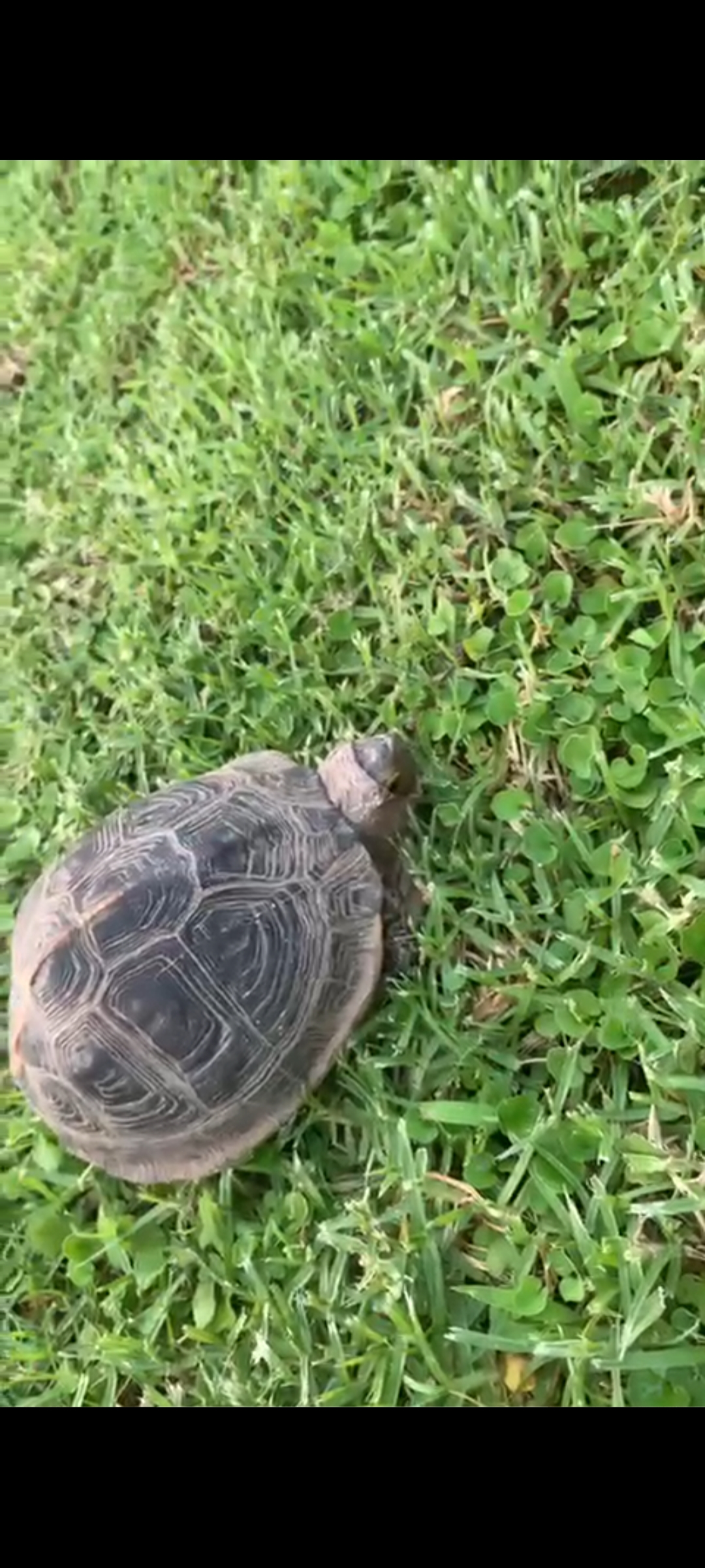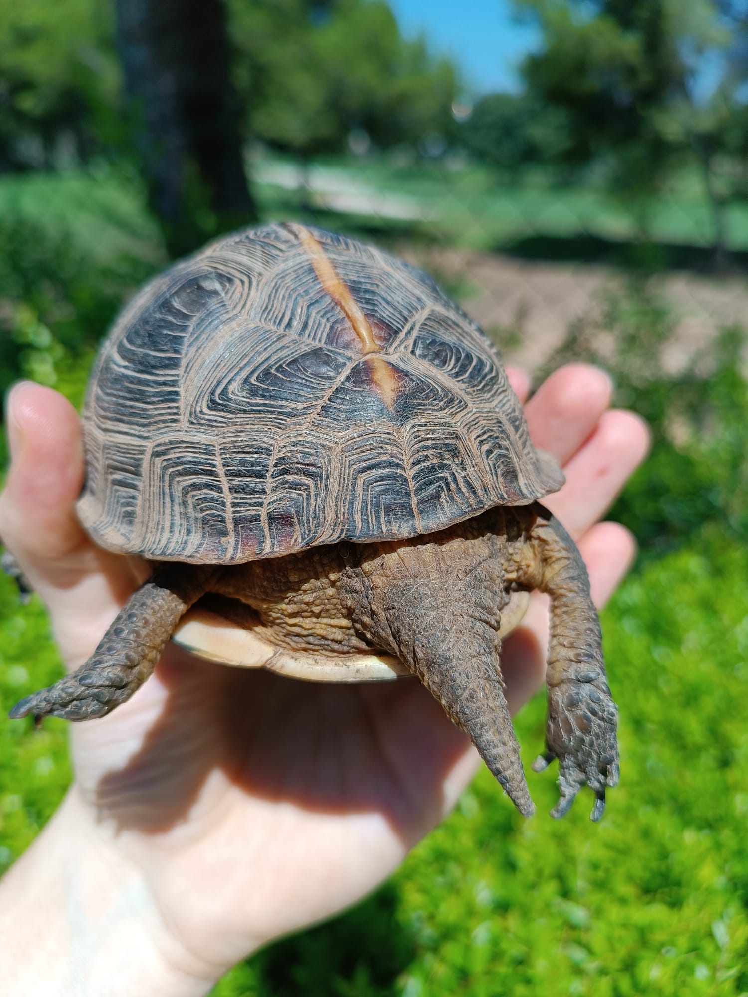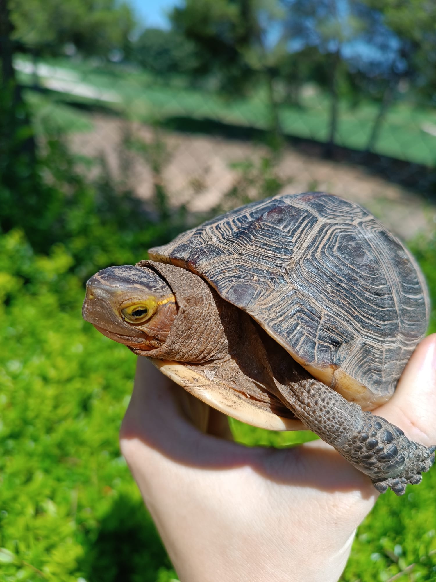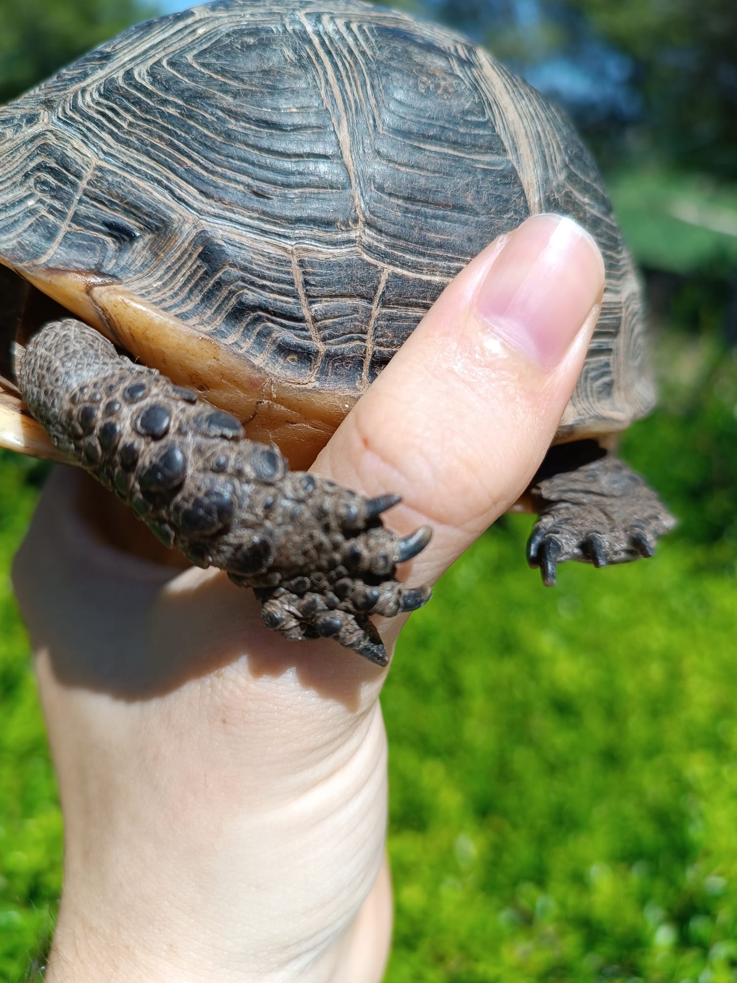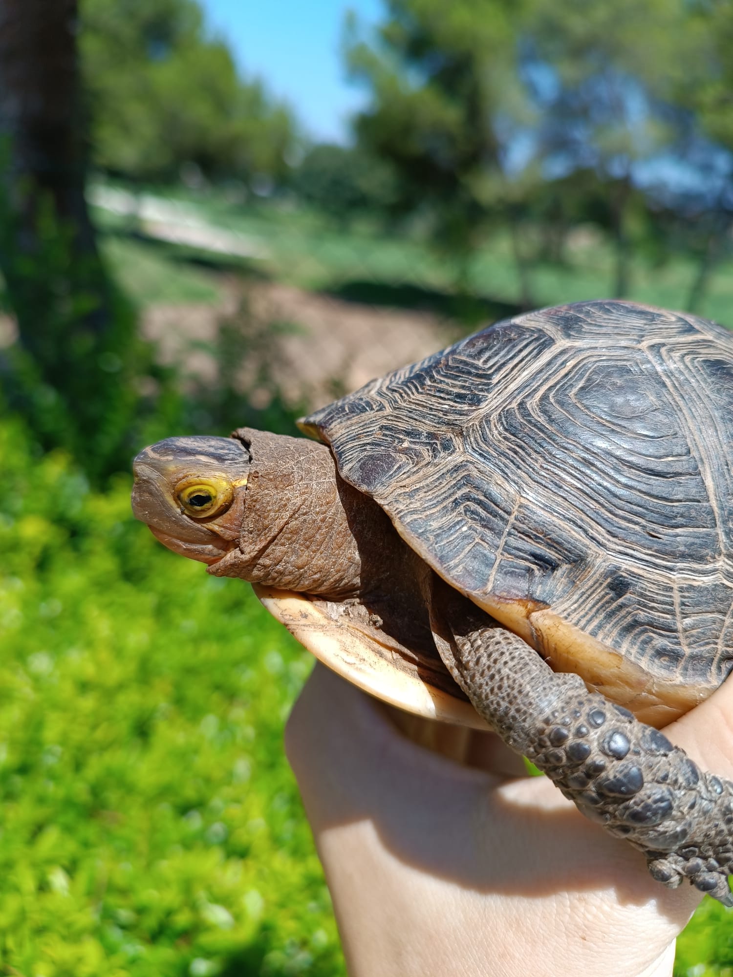Buenas tardes, os adjunto imagen de una tortuga que he encontrado en el jardín de mi urbanización, debe de ser de alguien porque no parece ninguna especie autóctona.