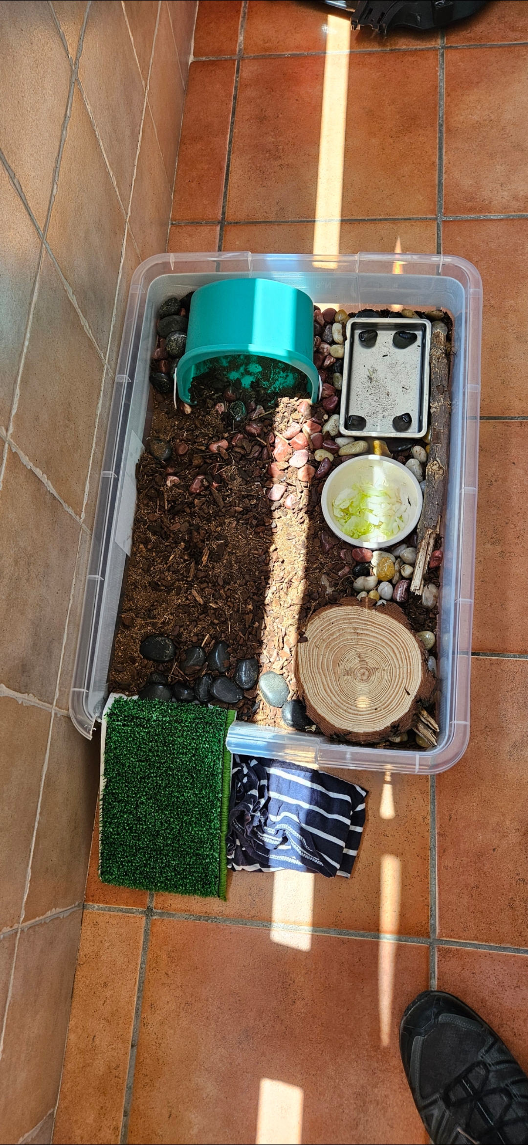 Bueno la tengo en terrario en tuper grande en terraza cerrada y lleva unos días que no come y según lo leído parece que iniciaría hibernacion,pero ya digo que con la temperatura que hace fuera no me cuadra.