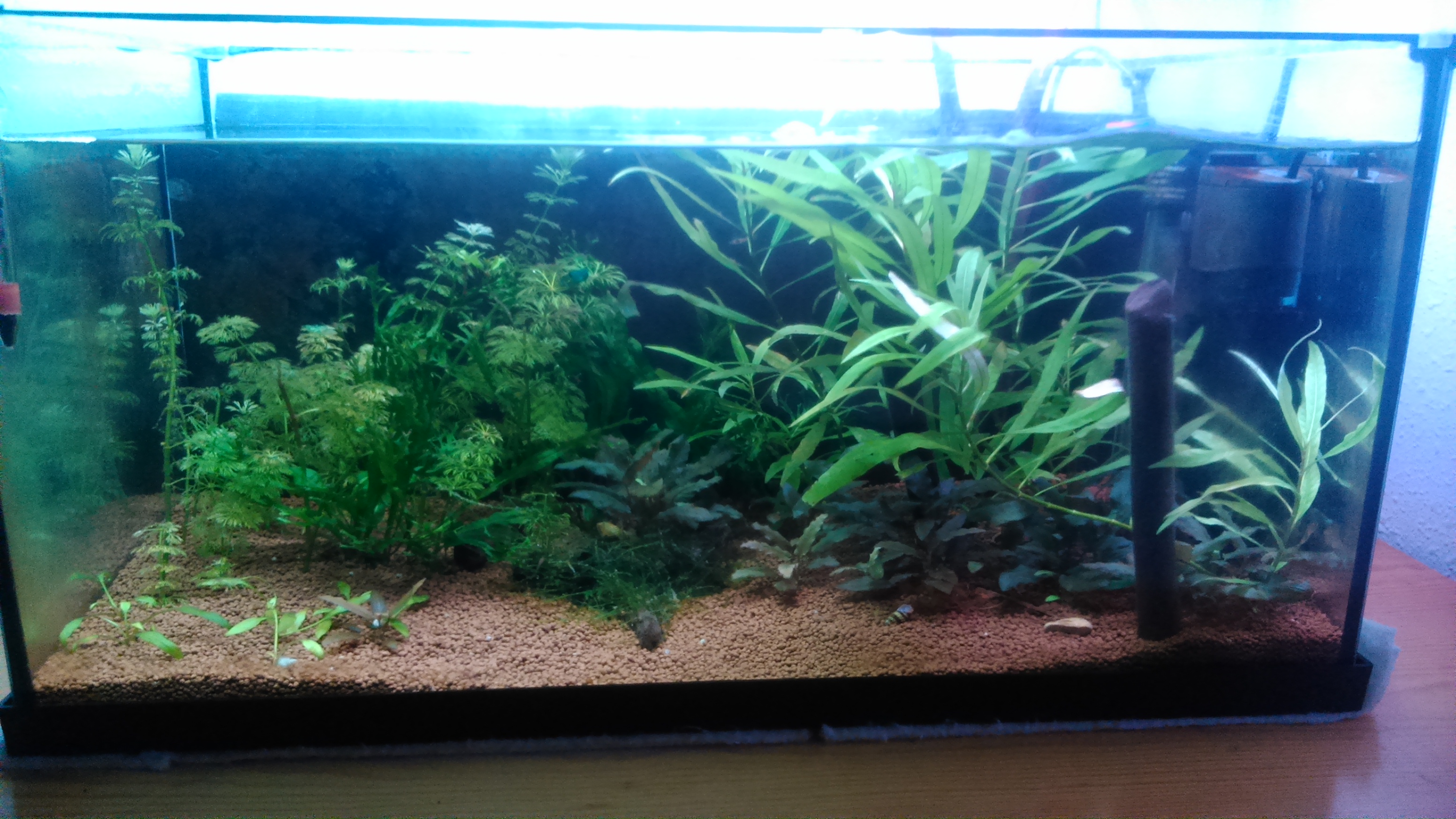 Las plantas que hay son Cryptocoryne wendtii, Cryptocoryne lucens, Ambulia sessiliflora, Hygrophila corymbosa y musgo de java. Si pudiese tener un tritón ya pondría otras plantas más como la cola de zorro y dejar sin podarlas para que lleguen a la superficie.