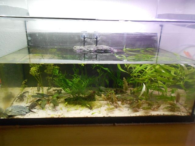 Le pondría una pequeña isla y al no tener tapa le haría un reborde alrededor para que no saliese del acuario.