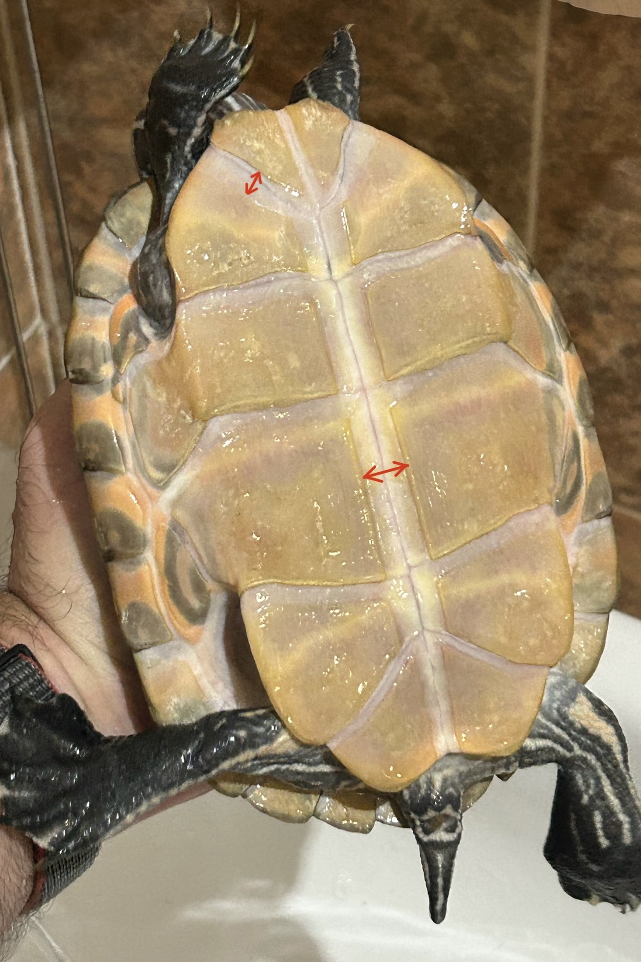 No sé si una de las causas por la que no termina de curar es que la tortuga crece de una forma descomunal y esto abre más la herida. En la foto podéis ver las marcas que han quedado en las placas y dejan ver su último estirón, el cual ha dado en menos de un mes.