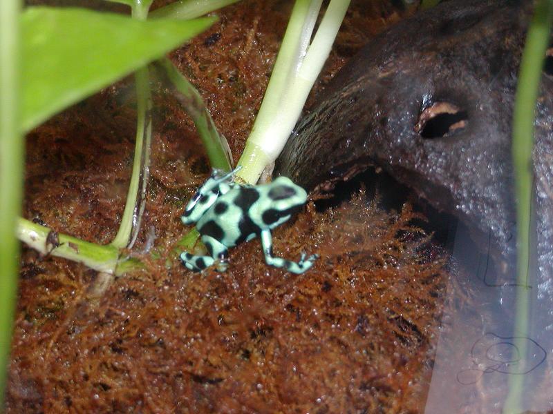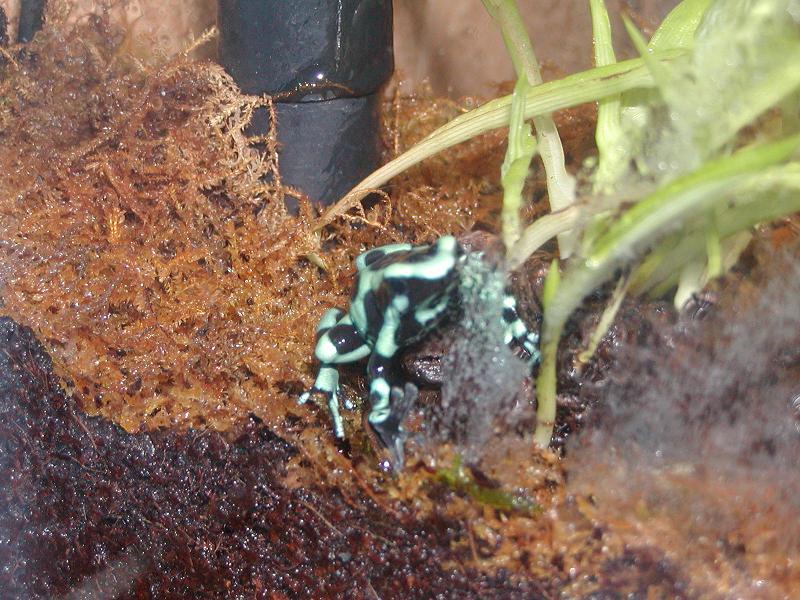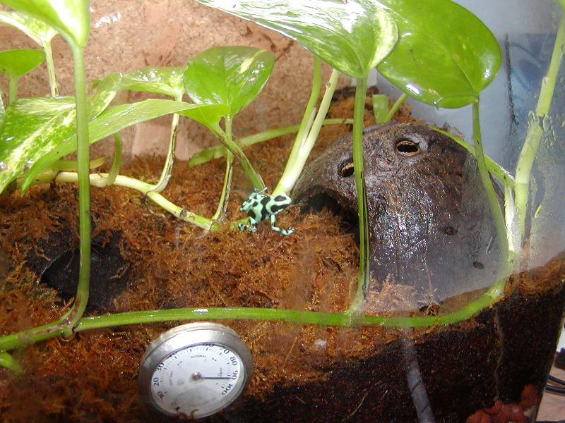 esta semana me dan por fin una pareja de dendrobates auratus verde. ya tengo el terrario listo mide 30x25x35 mantengo constante una temperatura de 24 grados de noche y 26 27 de dia. la humedad del 85 90% gracias a unos pequeños chorros d agua que caen en la parte trasera. Las medidas son algo justas, tengo tambien casi listo un terrario de 100x30x50 pero quiero tenerlas primero en el pequeño para controlarlas mejor. La iluminacion es correcta porke las plantas estan creciendo sin parar, tengo dos pothos y un pekeño tronco con "malas madre".