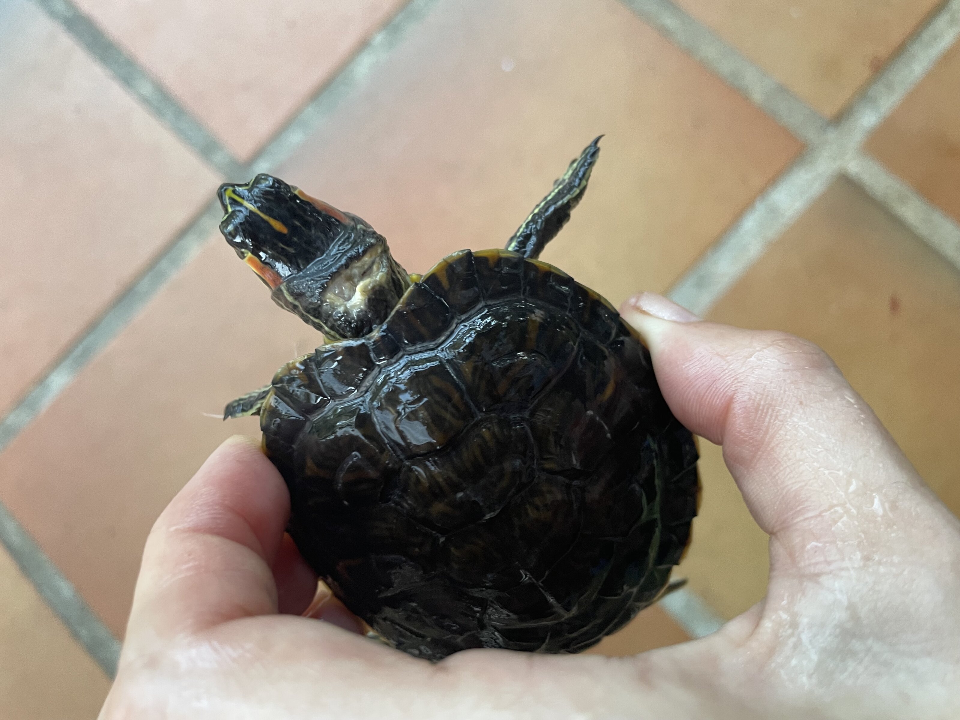 Hola , buenas tardes . La tortuga con el corte tiene infección . Le van a limpiar con láser la zona infectadas, pomada para el corte y unas inyecciones. La explicación de la veterinaria es que les pasó esto por qué tienen poca agua en el acuario y al tirarse de la piedra que les tengo se hacen daño con el caparazón en el cuello y de ahí esas heridas