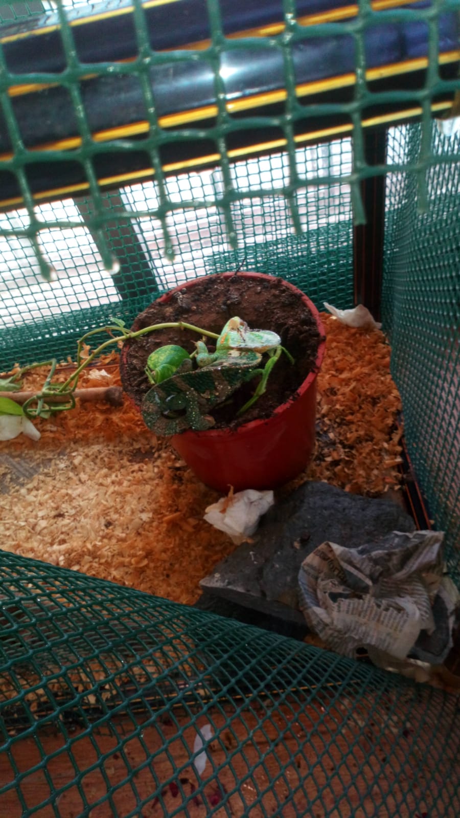 hola buenas noches el camaleón de mi novio cree que se callo de su jaula a la jaula de los grillos y se lo encontró con el cuerpo recto pero la cabeza torcida y que no se mueve pero respira abre la boca los ojos los mueve y las patitas poco pero hace movimiento ....pero no camina