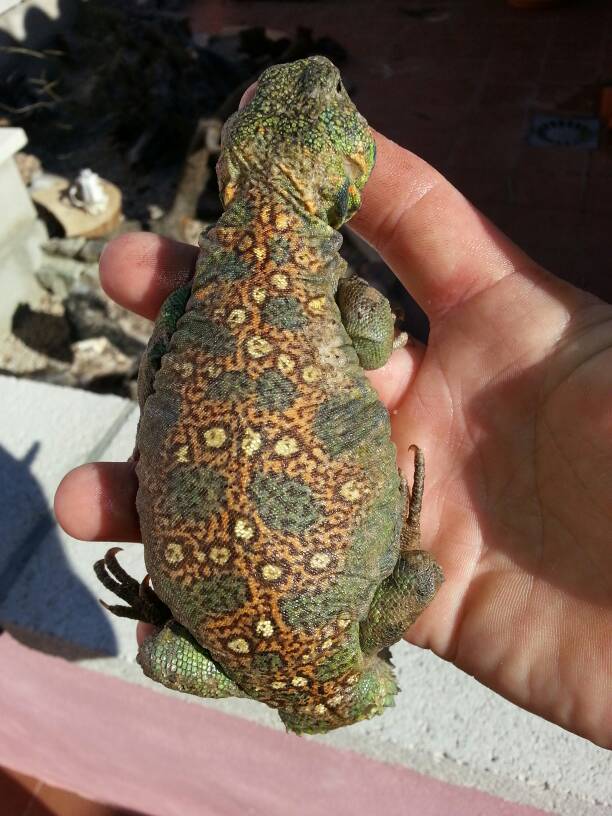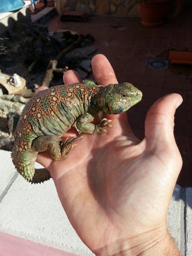 Es un animal muy activo, aunque algo asustadizo. Sé que es de captura, porque en la documentación que estoy esperando me tienen que dar el código de importación. Los poros preanales me dejaron claro que es un macho, pero como estoy a la espera de la documentación definitiva no tengo tan clara la especie aunque me dijeron que es Uromastyx ocellata. ¿Que opinais?.