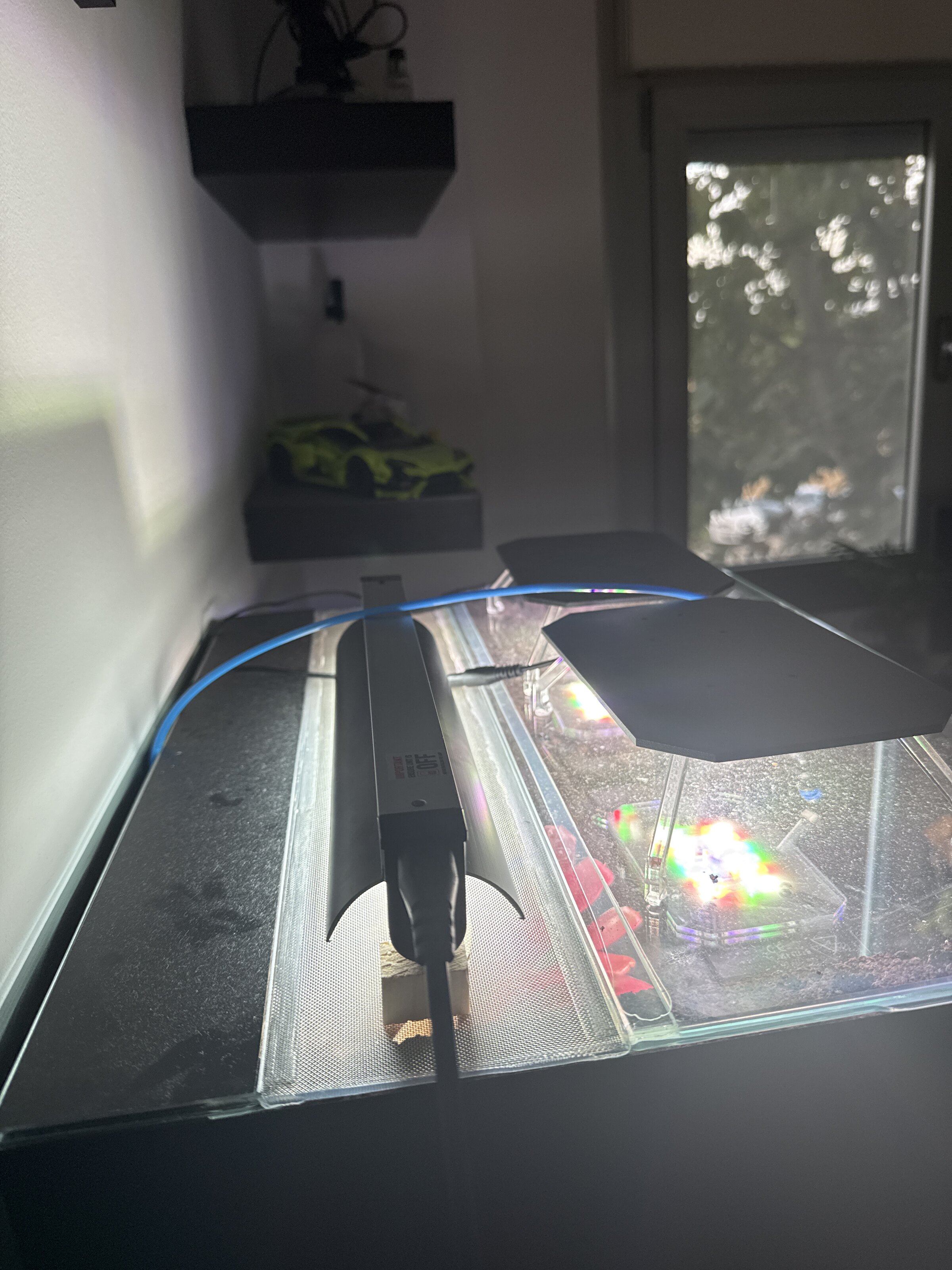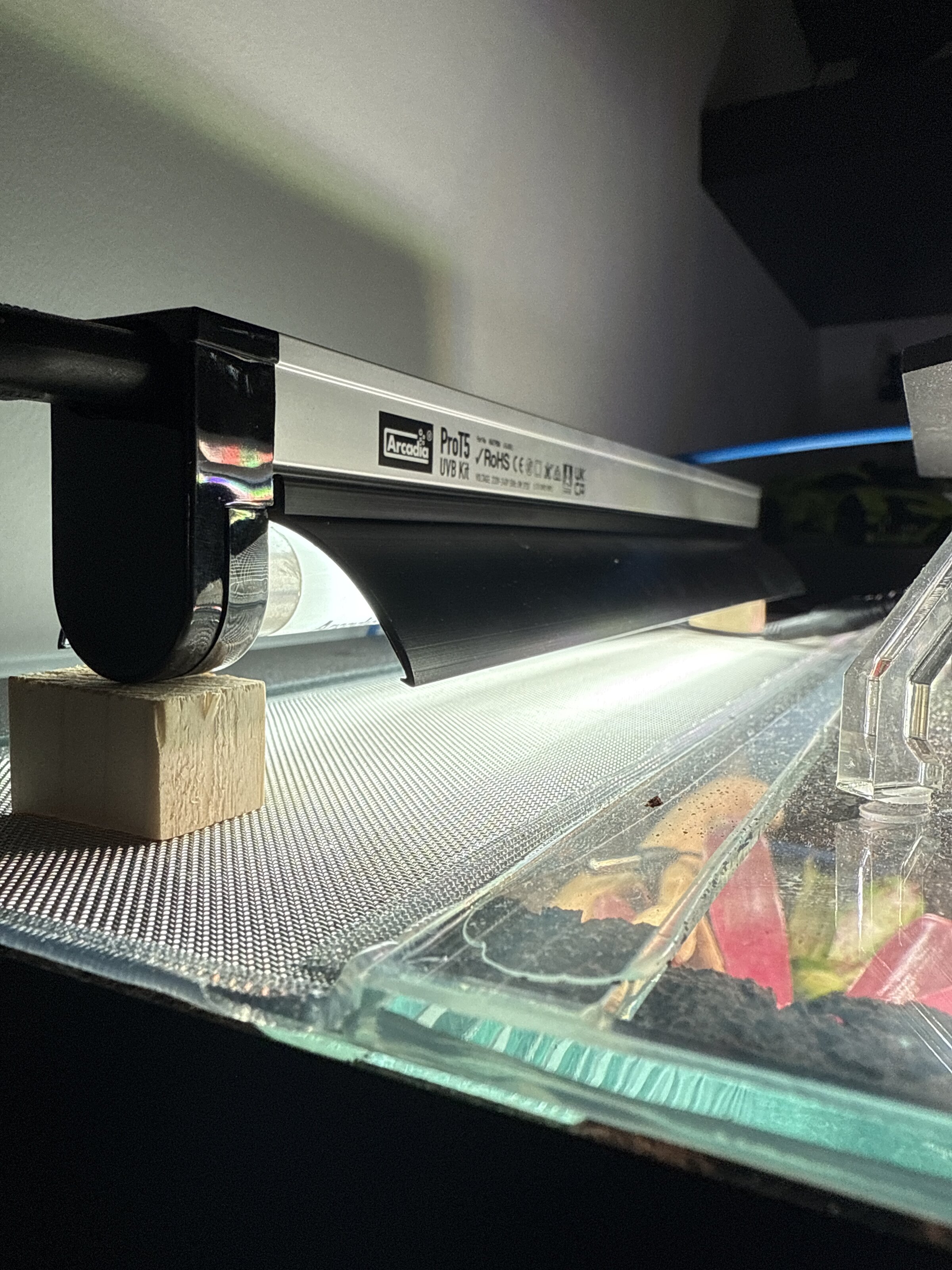 He colocado el tubo de esta manera que podéis ver en la imagen, por encima de la malla a una distancia del punto de basking de 10 cm.