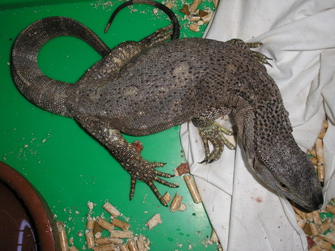 hola,algo un poco sorprendente ,en la calle se encontraron el viernes un varano albigularis de barba negra de unos 60 cm ,desnutrido ,escamas con mal aspecto sin ningun tipo de coloracion que les carateriza tan bonitos.Me llamaron pues saben que tengo aficion por los reptiles y aqui lo tengo hoy domingo en primer lugar e dado flagyl en su justa medida por si tubiese parasitos internos, luego septrin mas mycostatin por si tubiese cryptos povidium ya que los excrementos tiene un aspecto horrible esto ultimo me lo receto un veterinario de exoticos para unos eubles .Esto en medicacion pues el animal no se mantenia en pie y su aspecto muy mal. Comida le e forzado,(pues no quiere comer ), a comer carne triturada atraves de una jeringuilla y pinkis esto ultimo se lo comio bastante bien.Subi la temperatura de mi habitacion unos grados para mantenerlo con calor pues estaba helado .Si alguien puede ayudarme antes de llevarlo al veterinario seria de agradecer ,no soy un experto en varanos .Luego pondre fotos .No entiendo como alguien puede abondonar este animal , dudo donde estaba que se escapase .