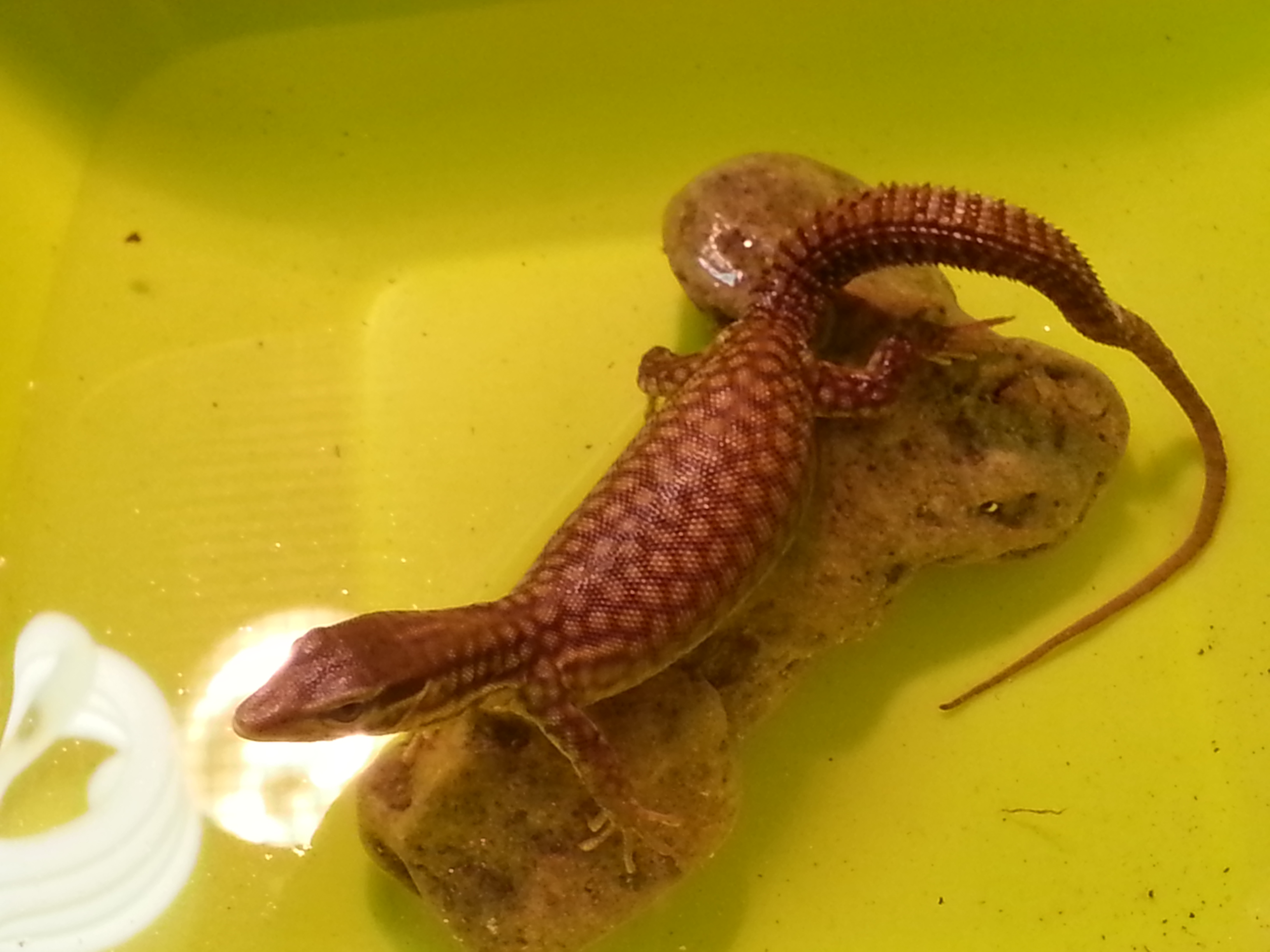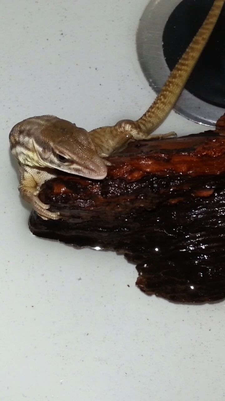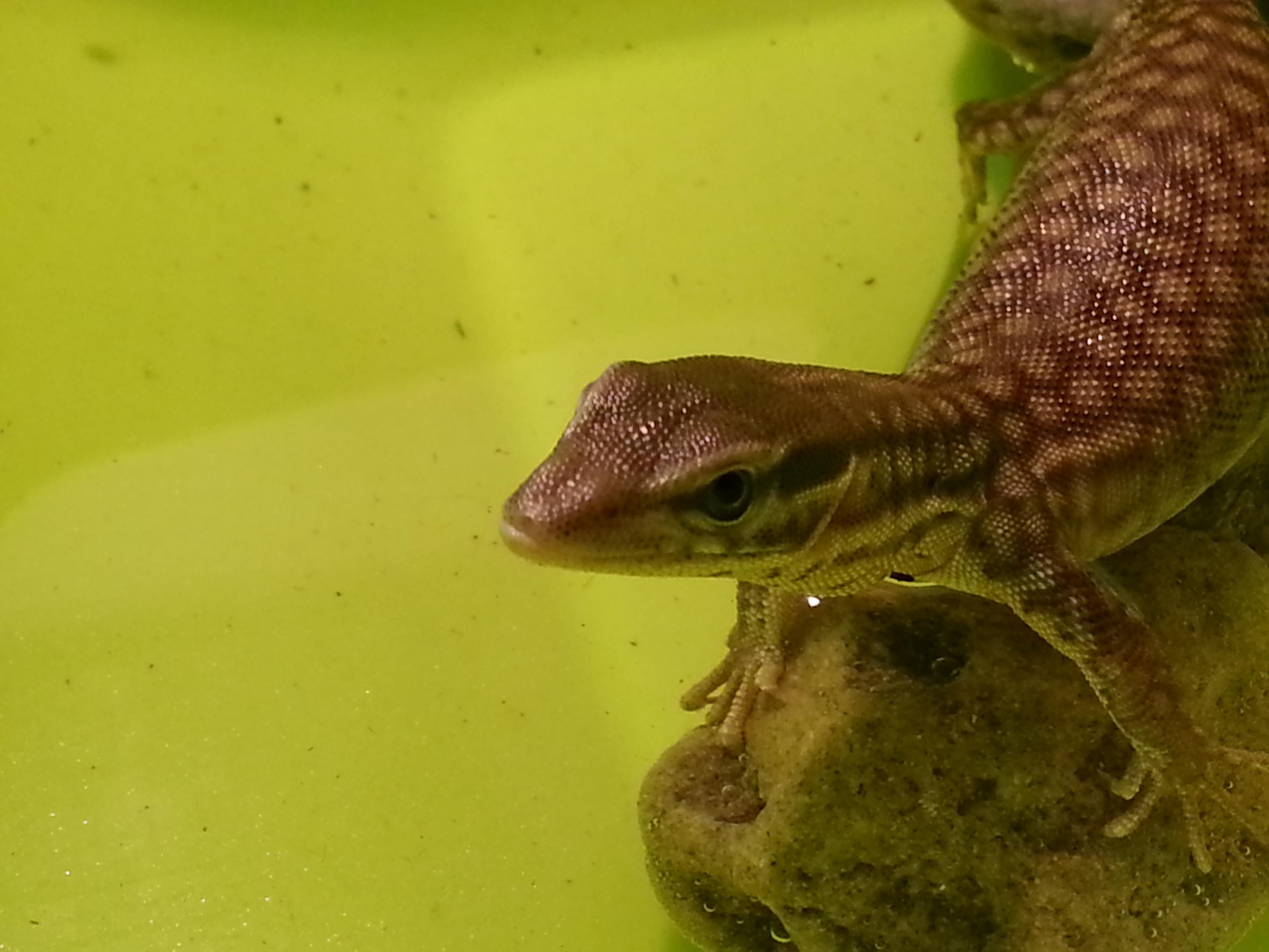 Le suelo poner agua tibia, más caliente que fría y cerca de la zona de calor en el terrario para evitar el tema de las corrientes, pero normalmente cuando se cansa del agua como le coloco una piedra en el cuenco, se sale para fuera y se pone bajo la lampara para secarse.