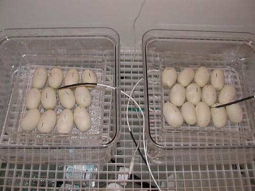 Bueno, finalmente hemos optado por la incubacion en "seco", podeis mirar este link: http://www.finegtps.com/breeding.html#Artificial%20Incubation