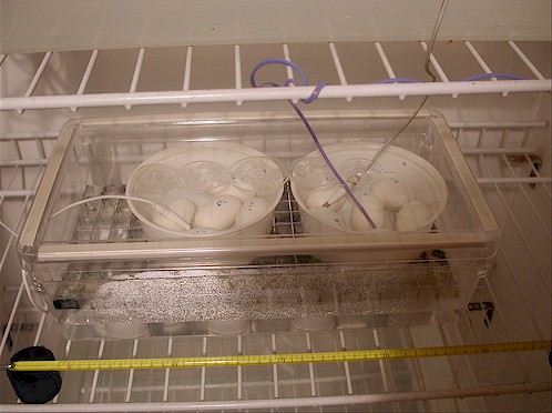 Pues ahí van unas fotos de la técnica de incubación "sin sustrato", me da la impresión que el término "en seco" resulta un poco confuso, aunque ciertamente se trata de evitar que los huevos contacten con una excesiva humedad, aunque si estén rodeados de una atmósfera muy humeda.