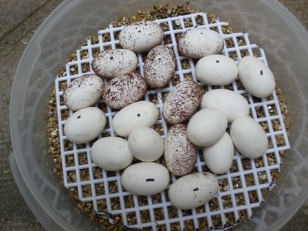 Por lo que comentan del peso, y del cese de la alimentación, la cosa pinta muy bien, pero ya digo que la coloración azul no necesariamente indica puesta, sino que la hembra ha empezado a producir "yema" (vitelo génesis), los folículos se desarrollan hasta convertirse en óvulos no fertilizados hasta el momento de la ovulación.