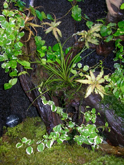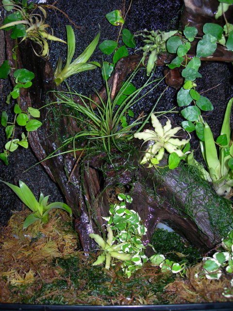 El vivario es una virguería, pero mucho ojo con demasiada agua, supongo que lo habrás mojado a conciencia para la foto, si no dejas secar las raices no podrán crecer las plantas, y tarde o temprano tendrás problemas de empobrecimiento de las mismas sobre todo en orquideas y bromeliaceas,
