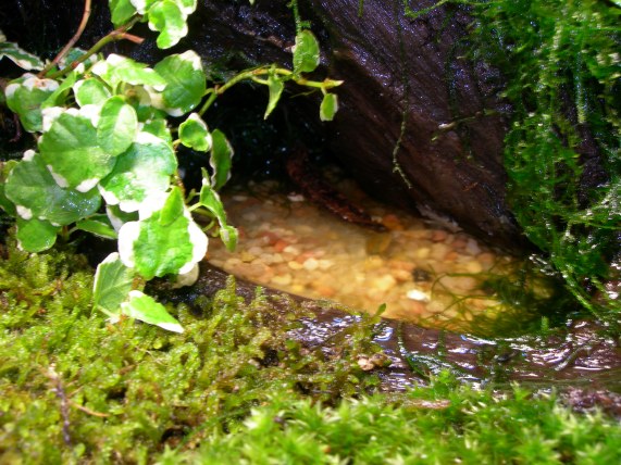 Gracias por las respuestas. Mide unos 60 de alto por 40 de ancho (mas o menos). Para que el estanque no se filtrara me corté una plantilla de acetato transparente con la forma de la cavidad y le di una capa fina de silicona neutra sobre la que pegué algunas piedrecitas. Luego a los bordes de esta plantilla les puse otro poco de silicona para crearme una "mini-piscina". Una vez que secó todo, lo metí dentro y tapé la silicona con musgo de java, para que no se vea. Espero que me entendáis... :p