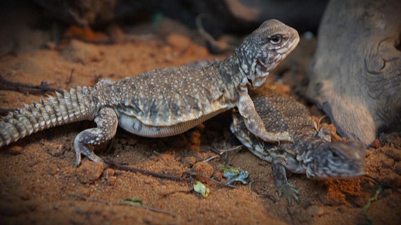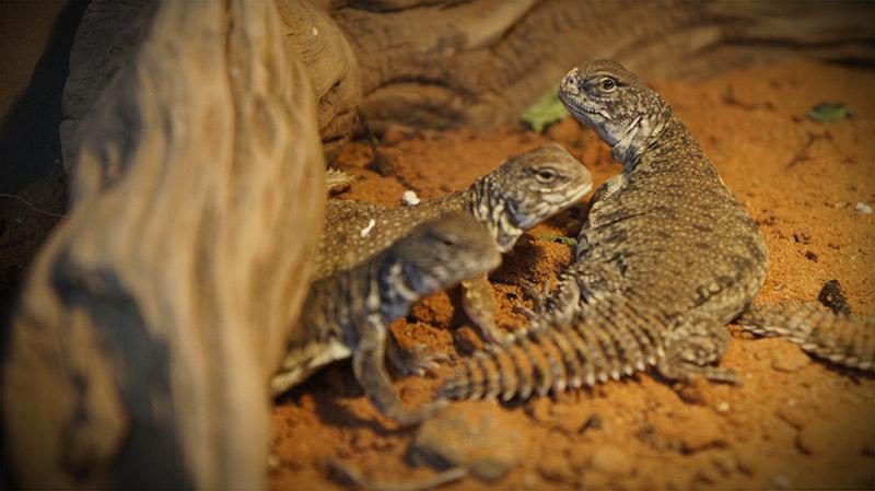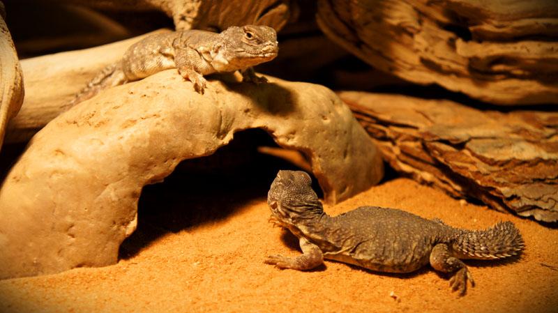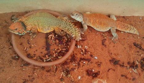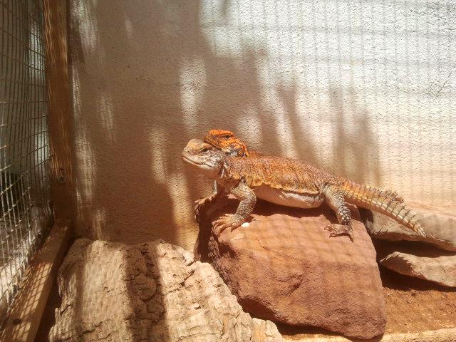 Les cambié la bombilla de 100W por una de 50W y vuelven a parecer una parejita feliz. Se apoyan uno sobre el otro para calentarse y se han acabado las persecuciones y mordiscos. Menos mal, porque me estaba mutilando al macho, al que le falta, después de estos brotes de violéncia, el final de la cola y los dedos largos de la pata de detrás.